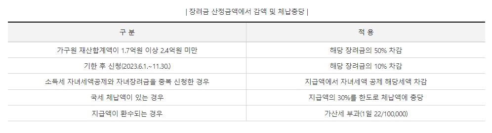 - 하반기분 지급 및 정산 시 작년 부부합산 총소득이 기준금액 미만이며 작년 6월 1일 현재 자구원 모두 재산 합계액이 2억 4000만원 미만이어야 합니다.