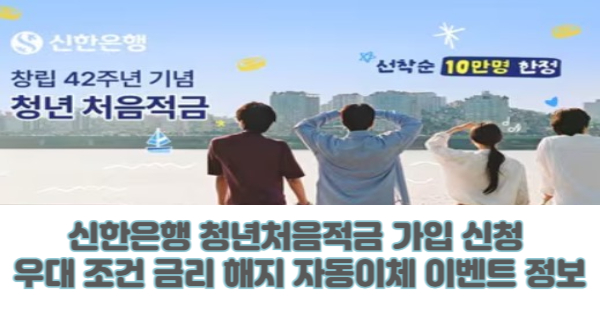 신한은행 청년처음적금 가입 신청 우대 조건 금리 해지 자동이체 이벤트 정보를 소개해드리겠습니다. 이 문서를 전체적으로 읽어주시면 신한은행 청년처음적금 가입 신청 우대 조건 금리 해지 자동이체 이벤트 정보를 이해하시게 될 것이라고 기대하고 있습니다. 신한은행 청년처음적금 가입 신청 우대 조건 금리 해지 자동이체 이벤트 정보의 지식이 필요하면 모두 읽어주세요. 이제 아래에서 정보를 드리겠습니다.