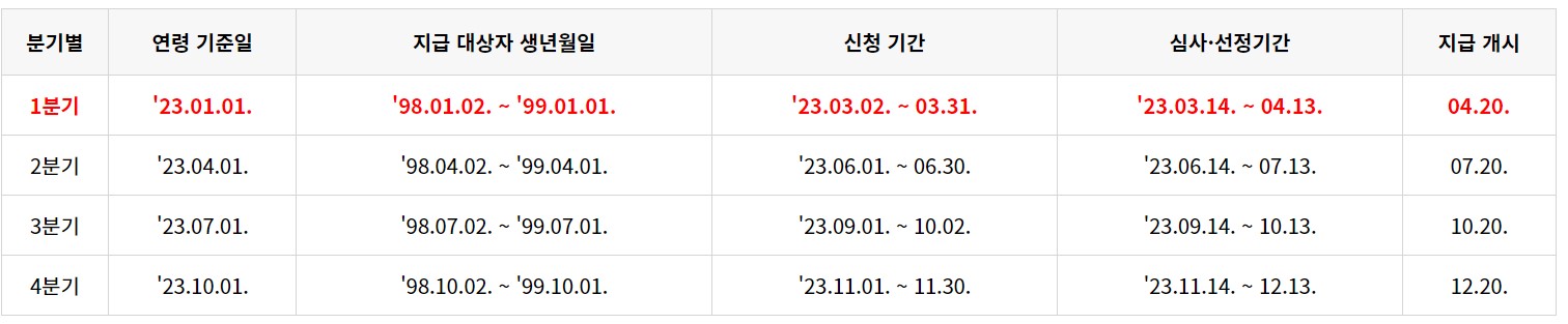 2023년 1월 1일 기준 만 24세 청년에 한해 지난 분기 미신청분 추가 신청 가능