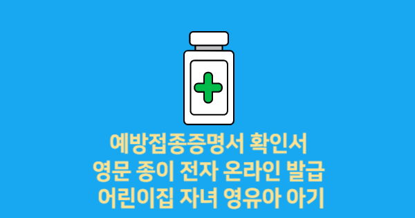 예방접종증명서 확인서 영문 종이 전자 온라인 발급 어린이집 자녀 영유아 아기 바로가기 를 공유해보았습니다. 전부 읽어주셔서 감사합니다. 다른 지식도 필요하시다면 위의 글들을 참고하세요. 이 문서가 유익했다면 구독, 좋아요, 하트(공감)를 부탁드립니다.