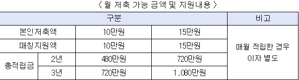 월 저축 가능 금액/ 지원 내용