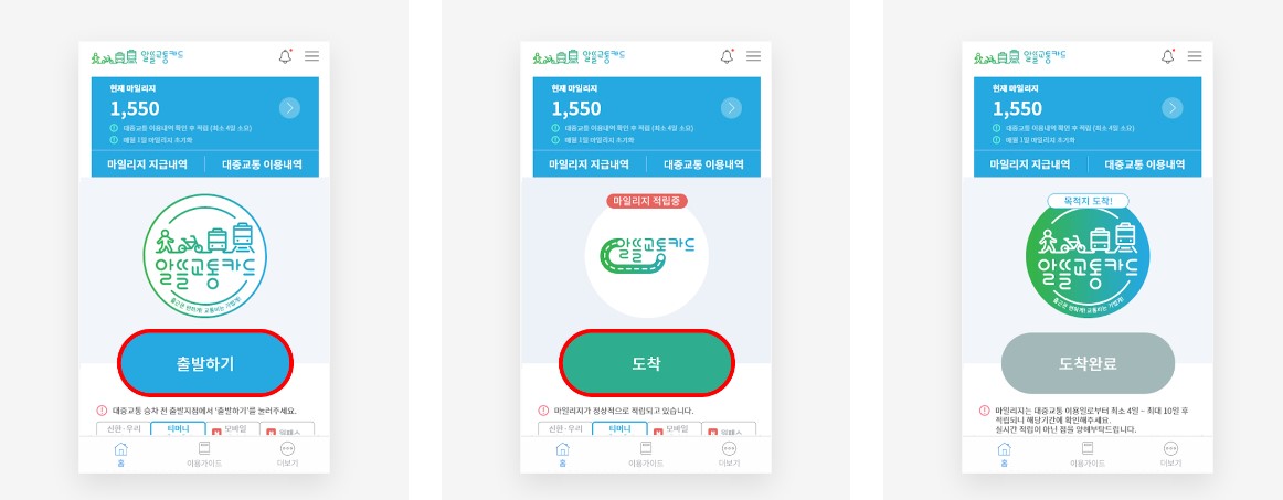 - 적립시작하기 : 출발지에서 출발 후 화면 중앙에 위치한 출발 버튼을 터치하면 적립이 시작됩니다.