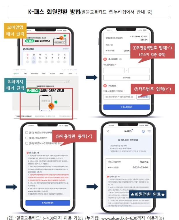 전환 절차는 모바일 앱이나 누리집을 통해 할 수 있으며, 현재 사용 중인 알뜰교통카드의 카드번호와 주민등록번호를 입력하고 이용약관에 동의하기만 하면 됩니다.